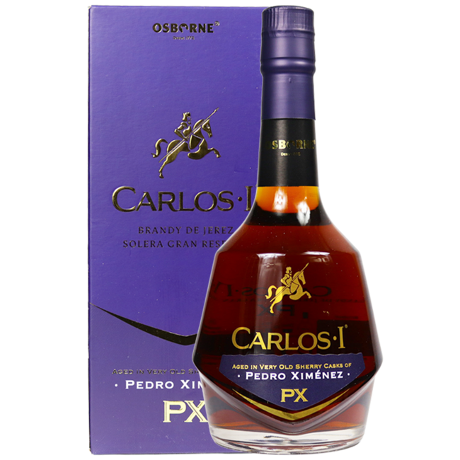 Carlos I Pedro Ximenez Brandy de Jerez Solera Gran Reserva is een verfijnde Spaanse brandy (Brandy de Jerez) uit de Denominación de Origen Jerez in Andalusië, geproduceerd door het iconische merk Osborne. Deze expressie rijpt via het traditionele Solera-systeem in vaten die eerder zijn gebruikt voor Pedro Ximénez-sherry, wat zorgt voor extra diepgang, zoetheid en complexiteit.